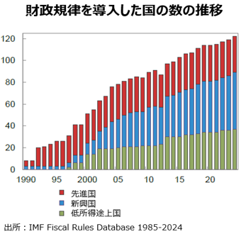 最新(2025年10月)の国際通貨基金(IMF)の財政規律に関するレポート1によれば、2000年以降、財政規律を導入する新興国が急速に拡大しています(図表を参照)。1990年代は先進国で財政規律の導入が進みましたが、2000年以降は新興国での導入増が目立っています。特に2020年以降、先進国で財政規律を新たに導入したのは1カ国なのに対し、約10カ国の新興国が新たに財政規律を導入しています。