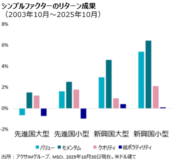 EQIの運用アプローチは市場環境に左右されない一貫性を備えており、特に非効率性が大きい新興国小型株市場でその強みが最大限に発揮されています。さらに当運用チームが磨き上げてきたファクター投資は、こうした市場構造のゆがみを捉えやすく、継続的リターンの創出に大きく貢献しています。まずシンプルファクターにおいては、新興国、さらに小型株へ対象を移すほどファクター効果が強まる傾向が確認されています。特にバリューとモメンタムの優位性が顕著で、新興国小型株式市場ではこれらのリターン差が大きく拡大しています。
