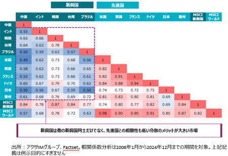 新興国市場は先進国市場との相関が低く、分散効果があると考えられます。また、先進国間の相関の高さに比べると、新興国は国ごとのリターン特性を持ち、それぞれ独自の成長ストーリーを有しているため、新興国間においてもリターンが分散しやすくなっています。