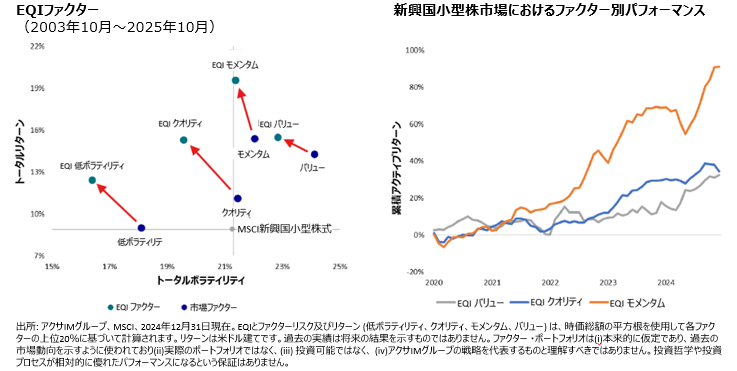 新興国小型株式市場では銘柄に関する情報遅延が比較的大きいため、良いニュースに対する株価反応が遅い傾向がある。EQIモメンタムは、この遅れを捉え続け、直近では90%を超えるアクティブリターンを実現(上記右グラフ参照)