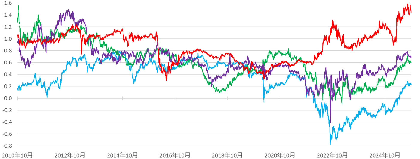 凡例:青線:ユーロ・スワップ金利、緑線:米国債、紫線:英国債、赤線:日本国債。出所:Barclays Live、イールドカーブは30年国債利回りから10年国債利回りを引いた差で示しています