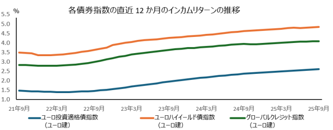 2025年のクレジット市場は活況が続いており、発行が増加したにもかかわらず、クレジット・スプレッドは年間を通じて縮小してきました。国債市場に対する超過リターンはプラスで推移しており、企業のファンダメンタルズは引き続き堅調です。クレジット市場の今後のパフォーマンスを左右するのは、バランスシート上の問題を抱えるソブリン債よりも分散された企業リスクを投資家が選好し続けるかどうかという点です。そのような評価が続くならば、クレジット市場の現在の利回りもなお良好であるため、インカムゲインを背景に堅調なトータルリターンが達成されるとみています。