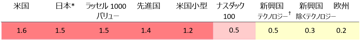 成長率には大きな差はないものの、上記の図表2を見ると、バリュエーションには大きな差があることがわかります。米国のバリュー株式指数と日本株式指数のPERはいずれも平均を大きく上回っており、欧州株式指数に最も割安感があります。