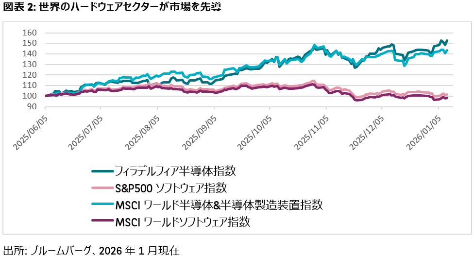 新しいコンピューター製造工場の建設には2~3年かかるため、市場では、ハードウェア不足は少なくとも2027年まで続くという予想も見られます。この長期にわたる供給面の制約は、他のテクノロジーセクターよりも半導体セクターに、米国だけでなく世界的に利益をもたらす可能性が高いとみており、特に、サプライチェーンの多くは依然としてアジアにあります。