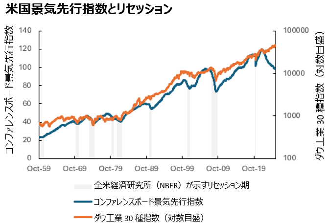 下記グラフをご参照ください。今週リンクト・インでこのグラフに類似するグラフを見て以下のように考えました。下記グラフは、米国コンファレンスボード景気先行指数をリセッション(景気後退)期とダウ工業30種指数と合わせて比較したものです。この先行指数は1959年から公表されており、その構成要素には、国債イールドカーブの傾き、製造業新規受注、失業保険申請件数、信用増加率などがあります。AIがこれまでの在り方を変えつつあるかもしれませんが、このグラフの解釈の一つとして、株式市場は今、景気後退と市場の調整局面に直面していることを示唆しているということです。