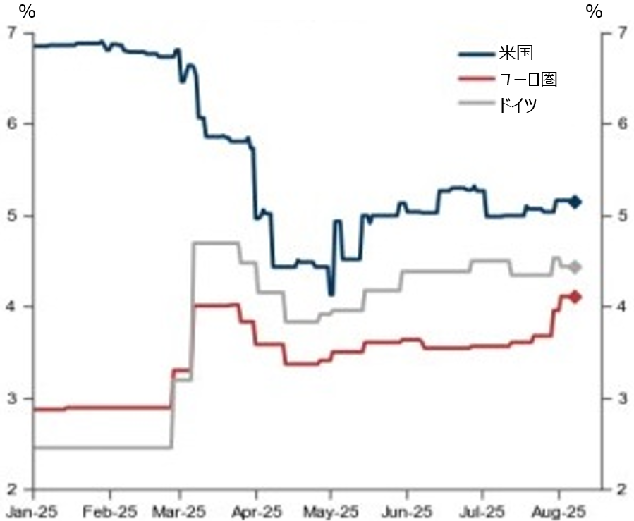 ユーロ圏全体のインフレ率はここ数か月、欧州中央銀行の目標である2%またはそれに近い水準で落ち着いています。これに対し米国のインフレ率は2.7%で、米政権の関税のため、物価圧力が高まるとみられます。