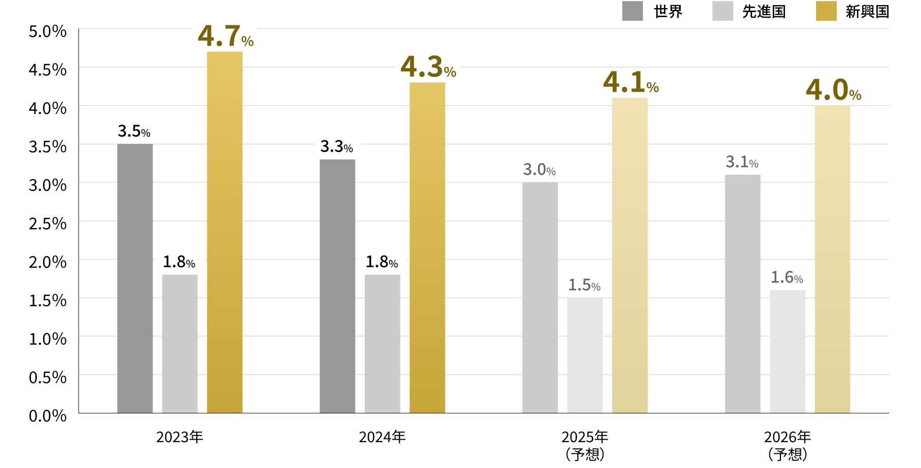 人口増加や内需の拡大などが原動力となり、新興国は相対的に高い経済成長が見込まれています。