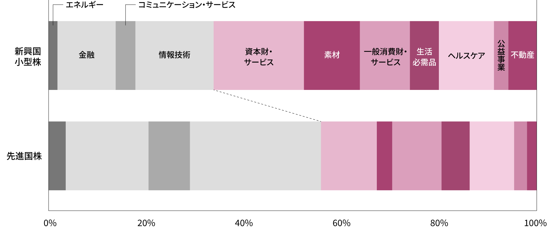 大型企業を中心とする先進国株には、安定した収益モデルを有している企業が多い傾向があります。それに対して、新興国小型株には成長段階にある企業が多く、各国の経済発展とともに成長を遂げる可能性を持っています。