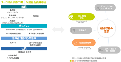この状況はユーロ債券市場の強みの一つとみています。他の地域と対照的に、ユーロ債券市場には複数の国債イールドカーブがあるため、最適な投資を行える機会が広がります。下記に示す通り、米国と比較して、ユーロ建て債券市場は超過収益の源泉として選択肢が幅広いため、世界の債券市場の中で独特の分散投資の機会を提供しています。
